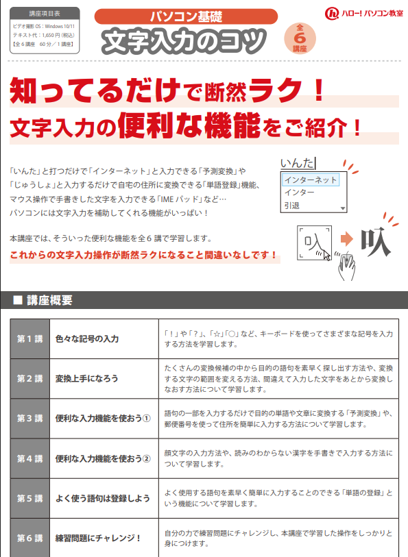 この講座では、知っているだけで作業が一気にラクになる文字入力のテクニックを、全6回でゆっくり丁寧に練習していきます。